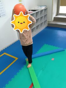 ボールサーキットでは、平均台の上でボールを落とさないように運び、バランス感覚や力のコントロール力を養います!